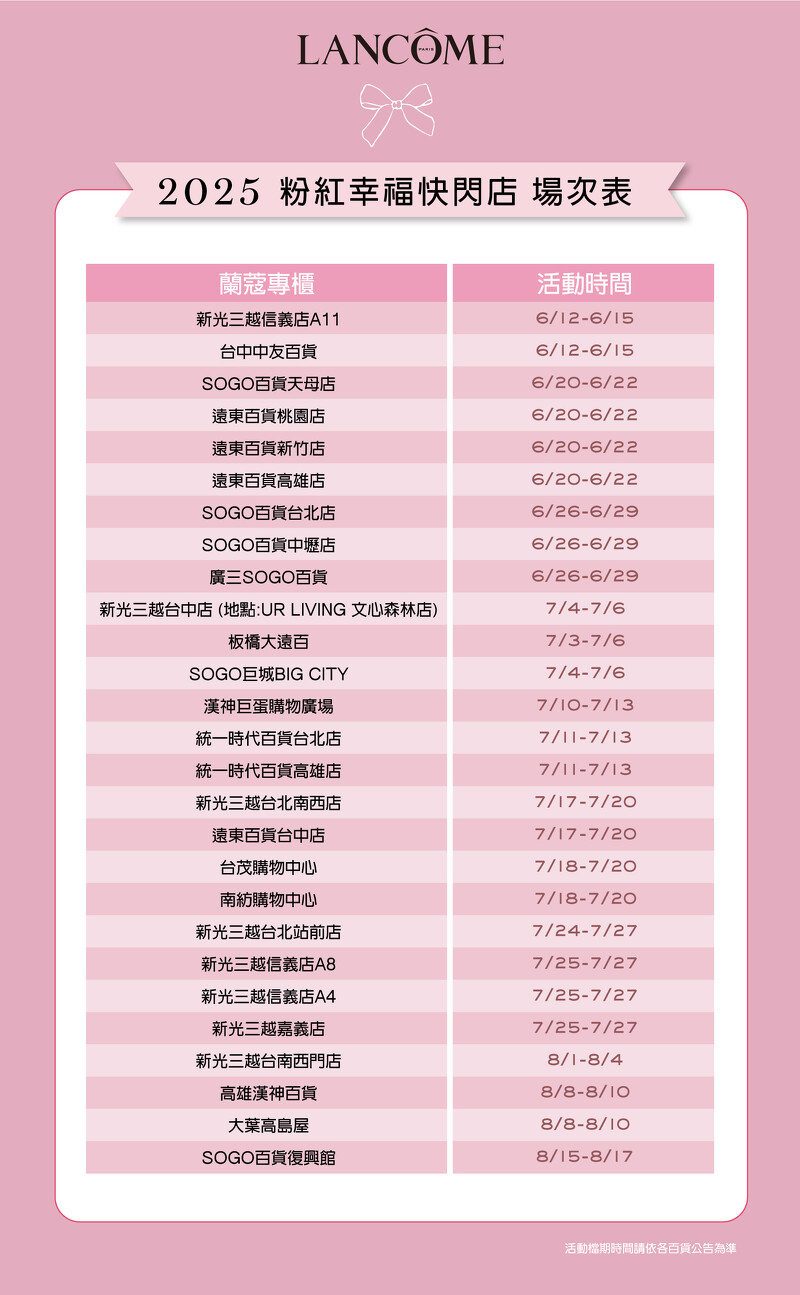*兰蔻粉红幸福快闪店 粉红拍贴机限定场次:SOGO百货台北店、新光三越信义店A4/A8/A11、新光三越台北站前店、新光三越台北南西店、板桥大远百、远东百货桃园店、SOGO百货中坜店、远东百货新竹店、台中中友百货、新光三越台中店(地点:UR LIVING文心森林店) 、远东百货台中店、新光三越台南西门店、汉神巨蛋购物广场、统一时代百货高雄店