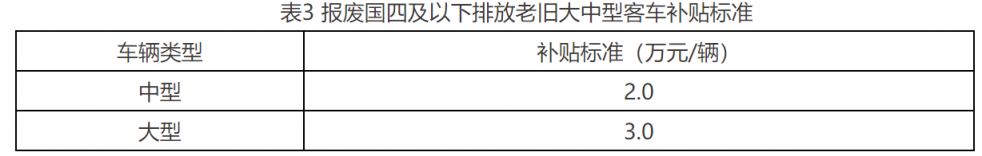 其中,报废国四及以下排放老旧大中型客车补贴标准见表3,更新新能源客车补贴标准见表4。