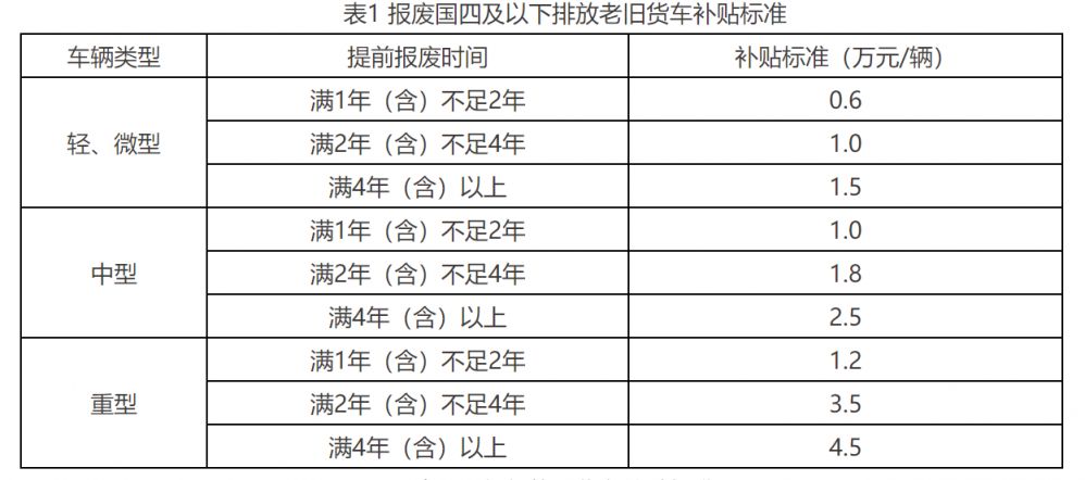 其中,报废国四及以下排放老旧货车补贴标准见表1,更新新能源货车补贴标准见表2。